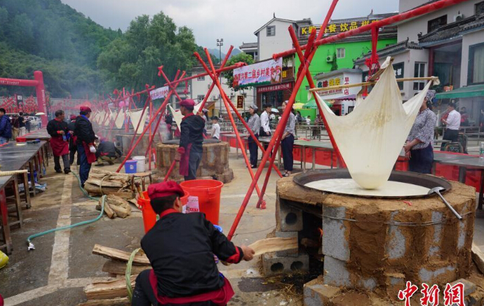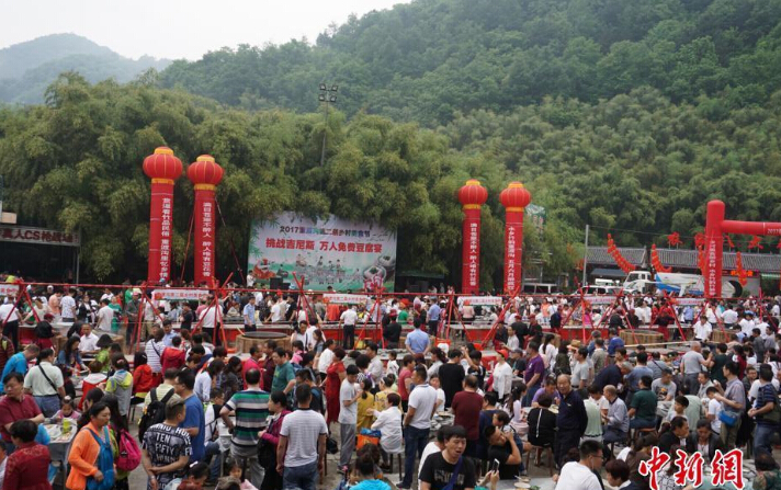 5月20日,河南欒川重渡溝景區,近萬(wàn)名游客在竹林環(huán)繞的大山里集體吃豆腐。