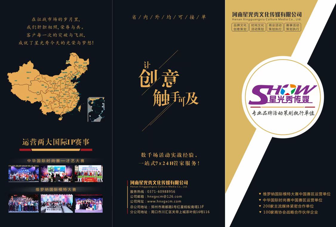 當前位置: 河南星光秀文化傳媒有限公司 > 服務(wù)項目 > 設計制作 > 企業(yè)宣傳單頁(yè)、折頁(yè)、畫(huà)冊、海報