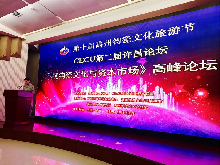 9月29日,由CECU中國企業(yè)資本聯(lián)盟、禹州市人民政府主辦,CECU許昌論壇秘書(shū)處、禹州市鈞官窯址博物館、禹州市鈞瓷研究所、禹州市試驗區管理辦公室承辦的鈞瓷文化與資本市場(chǎng)研討會(huì )在禹州鈞官窯址博物館學(xué)術(shù)報告廳舉辦。