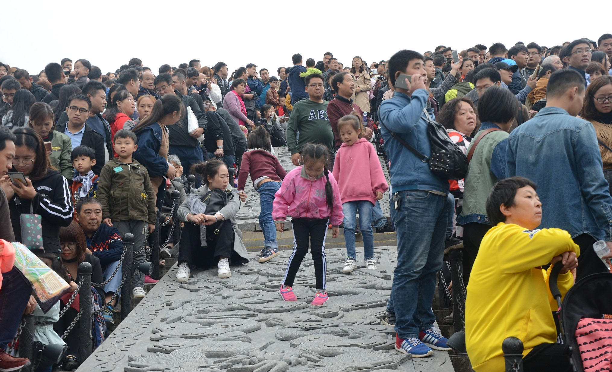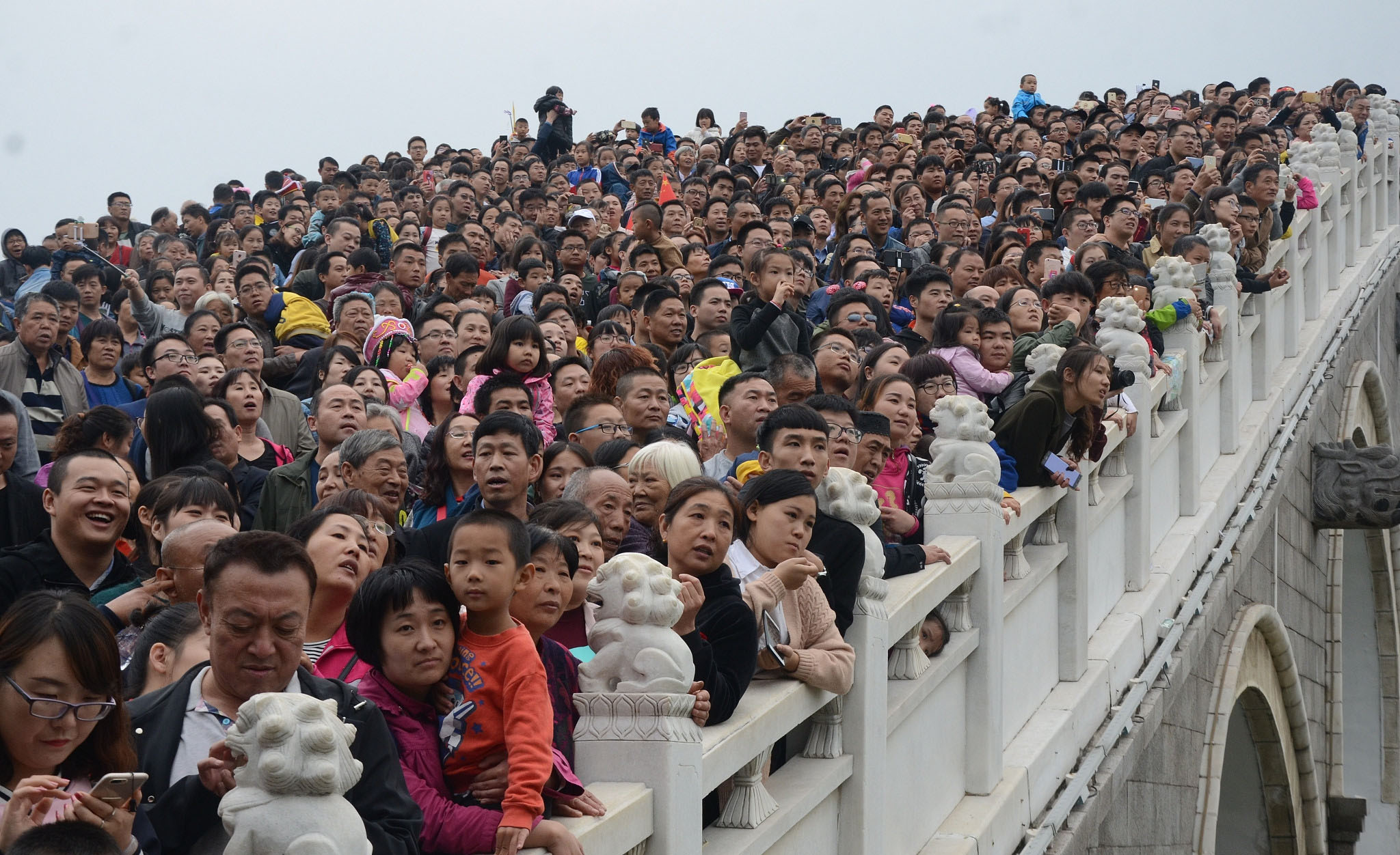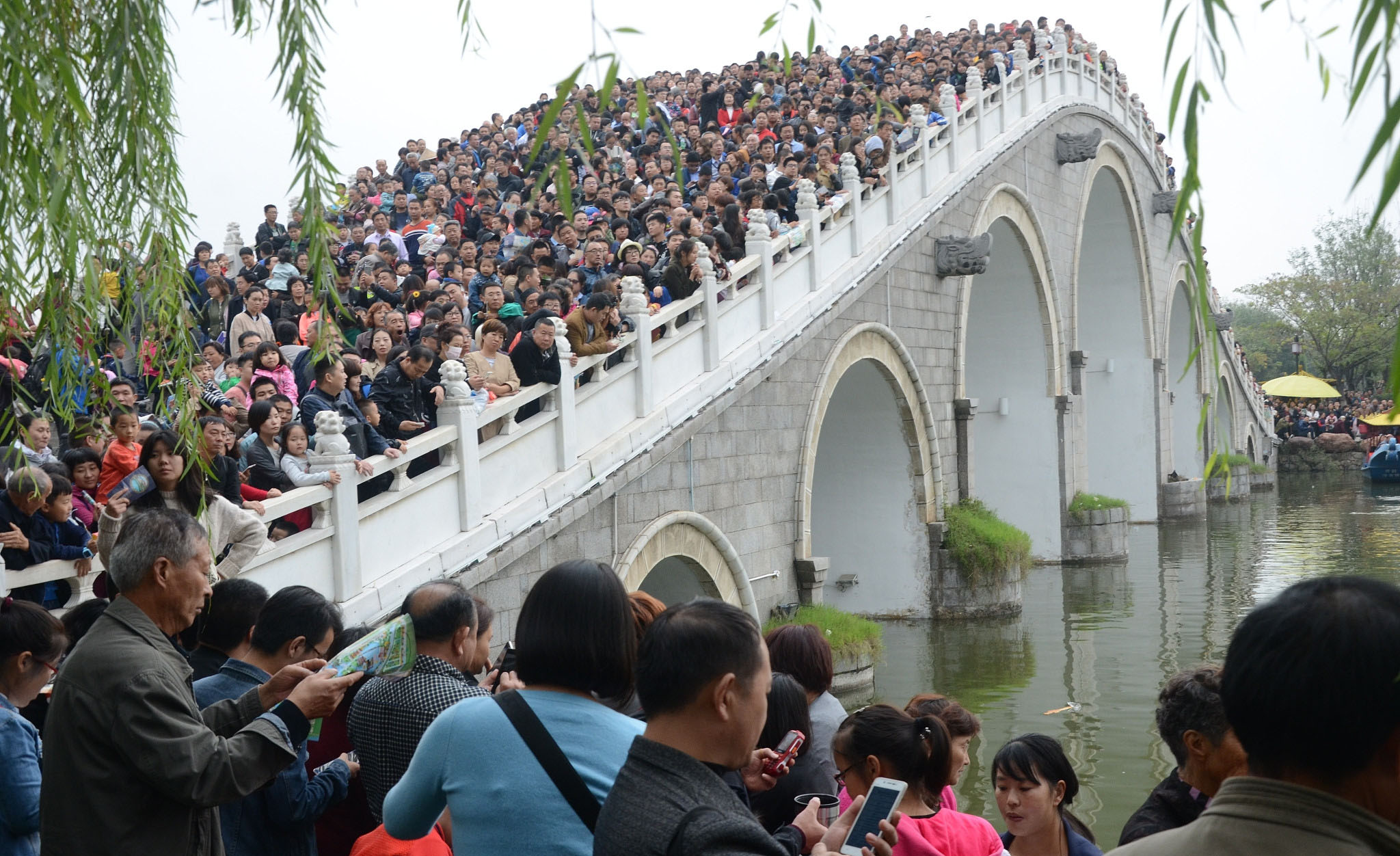 10月5日,在河南開(kāi)封清明上河園,眾多游人站在橋上看演出。當日清明上河園景區人流如織,景區表演處人山人海,很多游客無(wú)奈感嘆“到哪里,看的全是人!”
