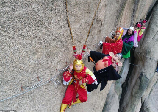 1111日,河南省駐馬店市,一對情侶在嵖岈山風(fēng)景區懸崖峭壁上拍婚紗照,吸引了唐僧孫悟空等師徒圍觀(guān)祝福。據悉,嵖岈山是中央電視臺《西游記》外景拍攝基地之一,西游文化成為景區靚麗名片。