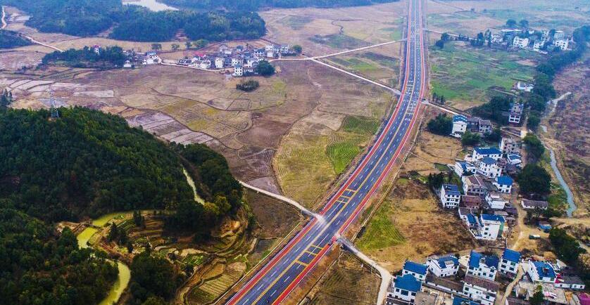 1月1日,航拍即將建成通車(chē)的江西省上饒市鉛山縣河永快速通道(河口至永平),該快速通道是鉛山首條彩色公路,宛如彩帶穿行于秀美鄉村之間。