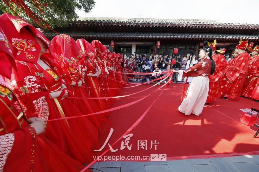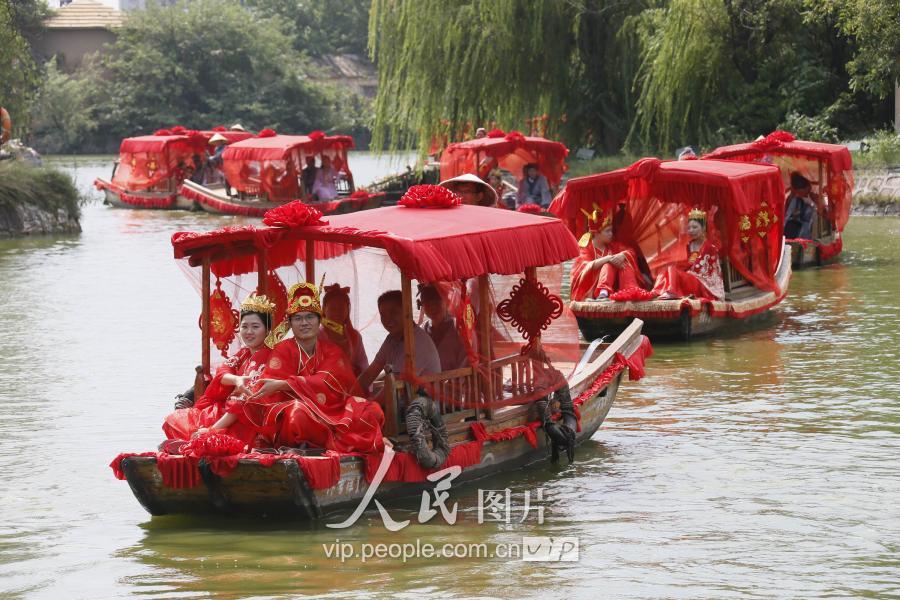 8月17日,農歷七月初七,河南開(kāi)封清明上河園景區舉辦了一場(chǎng)“穿越千年來(lái)娶你”大宋盛世婚禮,來(lái)自全國各地的20位準新人,在親朋好友和數萬(wàn)名游客的共同見(jiàn)證下,乘船同渡,喜結良緣。