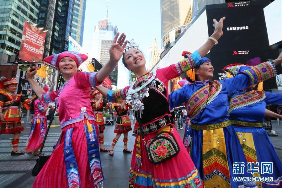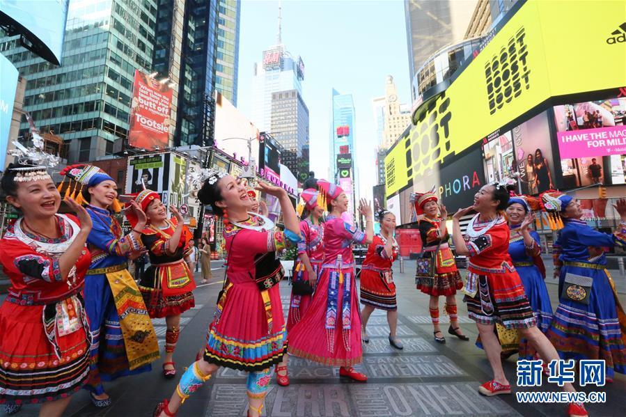 8月10日,在美國紐約時(shí)報廣場(chǎng),人們穿著(zhù)中國少數民族服裝演唱山歌。 當日,紐約當地廣西社團組織“鄉音播全球 山歌頌中華”活動(dòng),100多名華僑華人和外國友人歡聚一堂,將《山歌好比春江水》《多謝了》等中國民歌唱響紐約時(shí)報廣場(chǎng)。
