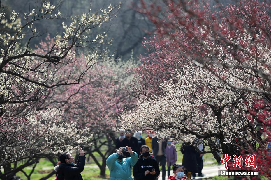 2月22日,游人在南京東郊梅花山賞梅拍照。近日,受新冠肺炎疫情影響而關(guān)閉的南京梅花山開(kāi)放,“淡妝宮粉”、“粉紅朱砂”、“江南宮粉”等梅花品種陸續盛開(kāi),吸引民眾前來(lái)徜徉花海沐浴春光。據悉,為確保安全,所有進(jìn)入景區的人員需要佩戴口罩,并進(jìn)行體溫測量。