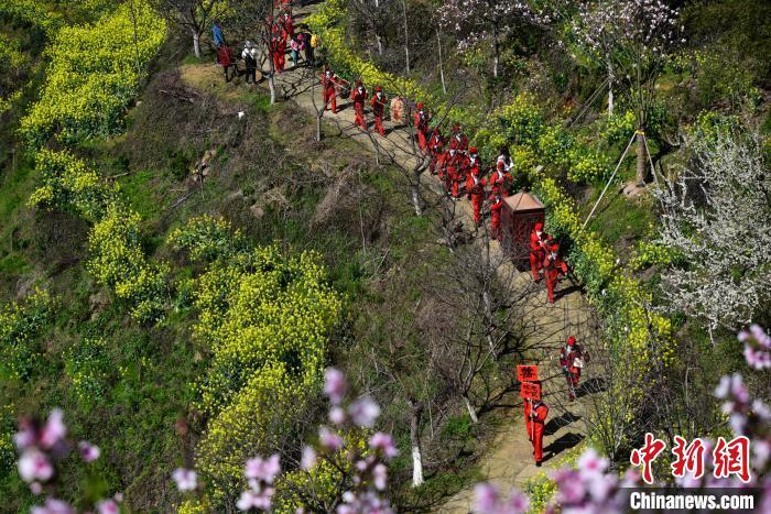 3月15日,儀仗隊22人頭戴“老鼠帽”,臉戴畫(huà)著(zhù)“老鼠胡須”的口罩集合出發(fā),村民們扛著(zhù)花轎、油缸、米甕、籮筐、鼠窩等“嫁妝”,將“老鼠”從村落“遣嫁”到村外。