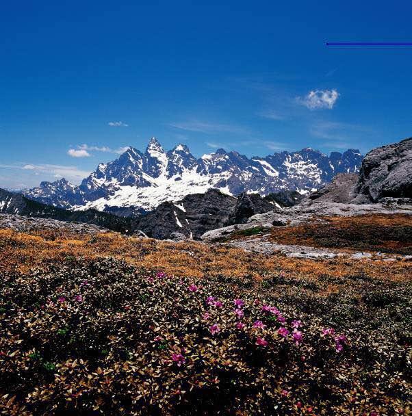 香格里拉地處“三江并流”腹地核心區,雪山峽谷、原始森林、鮮花草甸、高原湖泊星羅棋布。低緯度高海拔的特殊地理環(huán)境造就了香格里拉獨特的生態(tài)環(huán)境,春看百花,夏看水,秋看森林,冬看雪。其中,杜鵑花是香格里拉美景中濃墨重彩的一筆。