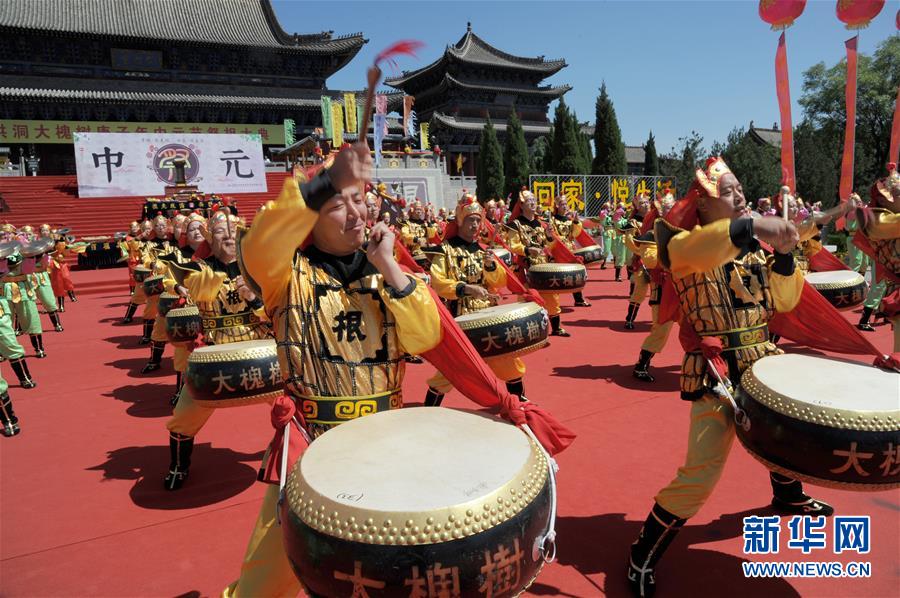 9月2日,演員在中元節祭祖活動(dòng)中表演威風(fēng)鑼鼓。 當日,山西省洪洞縣大槐樹(shù)尋根祭祖園舉行中元節祭祖活動(dòng)。