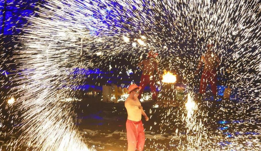 2月25日,農歷正月十四晚,河南開(kāi)封萬(wàn)歲山景區上演傳統民俗“打鐵花”,慶祝元宵佳節。圖為震撼的鐵花秀。